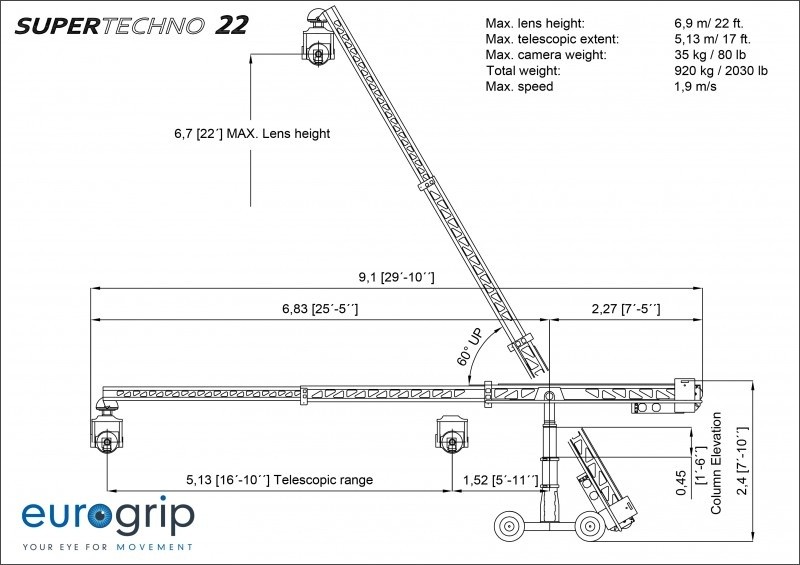 La SuperTechno 22 est la prochaine étape dans notre gamme de grues télescopiques. La 22 à le même profil et la même robustesse que ses grands frères (Techno 30 et Techno 50), mais elle reste adaptée aux zones relativement petites. La Techno 22 à l'avantage de pouvoir être équipée des caméras les plus lourdes.
